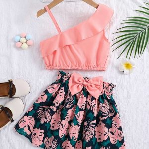 2 Uds Tops Con Volantes Y Cuello Asimétrico Y Falda Con Lazo Con Patrón Tropical, Ropa De Verano Para Niñas Pequeñas